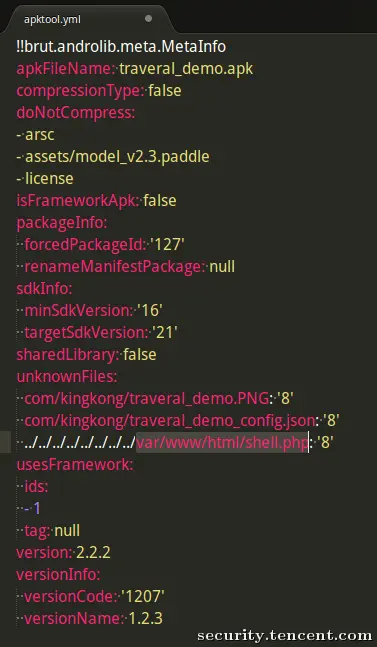 利用方式:恶意攻击者通过构造恶意apktool.yml文件,在unknownFiles字段中使用包含” ../“的路径,用户使用Apktool对该应用进行反编译时,造成释放、替换用户电脑对应路径下文件,甚至可造成代码执行的危害。
