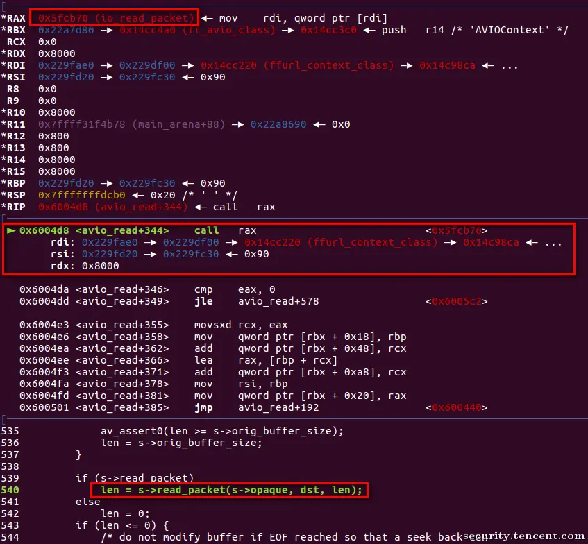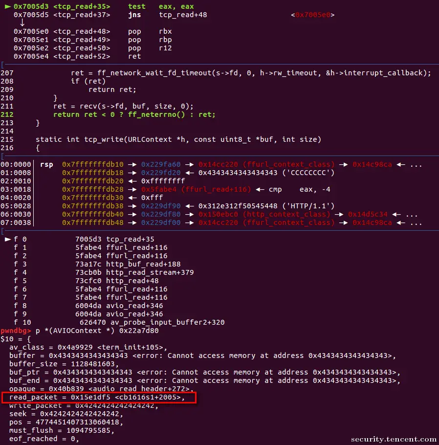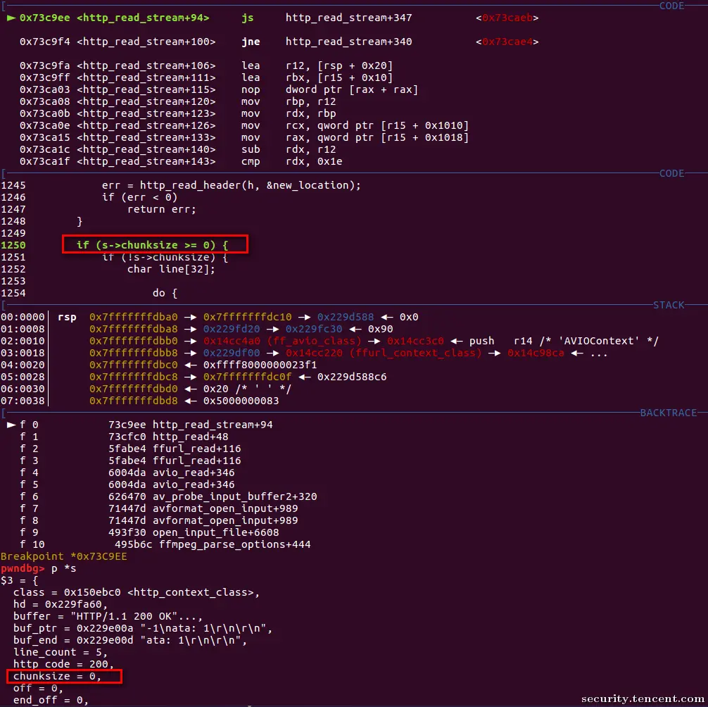 下面看下漏洞利用的整个调试过程,先发送包含Transfer-Encoding: chunked的请求头,然后avio_read函数中会循环调用s->read_packet指向的函数指针io_read_packet读取请求头之后的数据