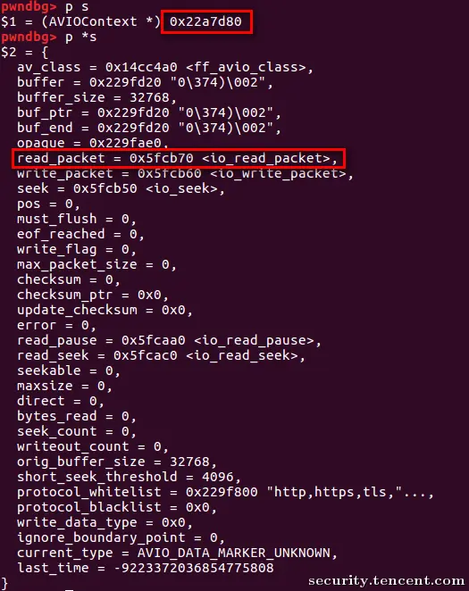 可以看到buf的地址是0x229fd20,而之前的AVIOContext的地址为0x22a7d80,因此buf在读入0x22a7d80 - 0x229fd20 = 0x8060字节后就可以溢出到AVIOContext结构体,这里溢出覆盖它的read_packet函数指针