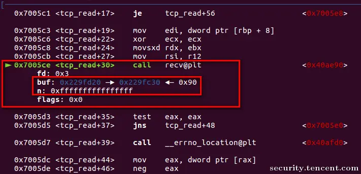 当执行到ret = recv(s->fd, buf, size, 0)时,如果size为负数,recv函数会把size转换成无符号数变成一个很大的正数,而buf指向的又是堆上的空间,这样就可能导致堆溢出,如果溢出覆盖一个函数指针就可能导致远程代码执行。