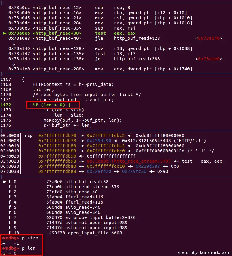 可以看到s->chunksize == 0,这时服务器发送chunk的大小为-1,然后就会执行s->chunksize = strtoll(line, NULL, 16)把s->chunksize赋值为-1,并在执行size = FFMIN(size, s->chunksize)后把size赋值为-1,之后来到http_buf_read函数