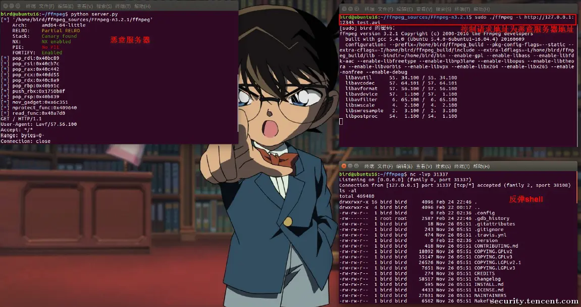 此漏洞主要是由于没有正确定义有无符号数的类型导致覆盖函数指针来控制PC,微软在Windows 10中加入了CFG(Control Flow Guard)正是来缓解这种类型的攻击,此漏洞已在github.com/FFmpeg/FFmp…中修复。另外对于静态编译的版本,ROP gadget较多,相对好利用,对于动态链接的版本,此漏洞在libavformat.so中,找到合适的gadget会有一定难度,但并非没有利用的可能。