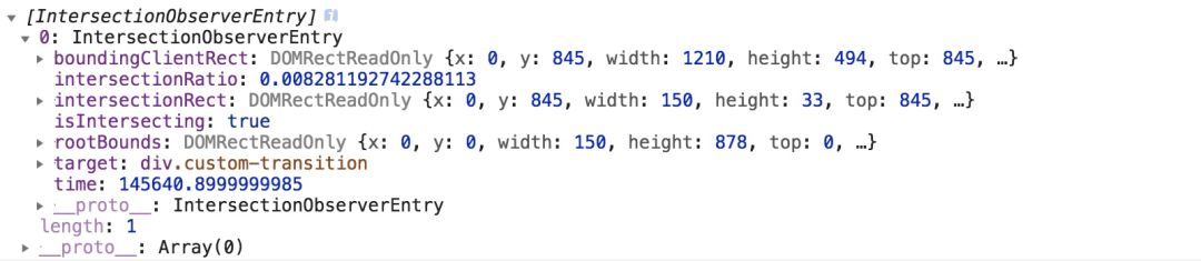 (1)callback, 触发的回调函数,当被观察元素与根元素视口发生交集,或交集部分大小发生变化的时候被执行,返回每次相交时的交集信息。接受两个参数,第一个参数是交集信息,以 IntersectionObserverEntry 对象数组形式返回,第二个是观察者本身。下面先来打印一下交集的返回信息。