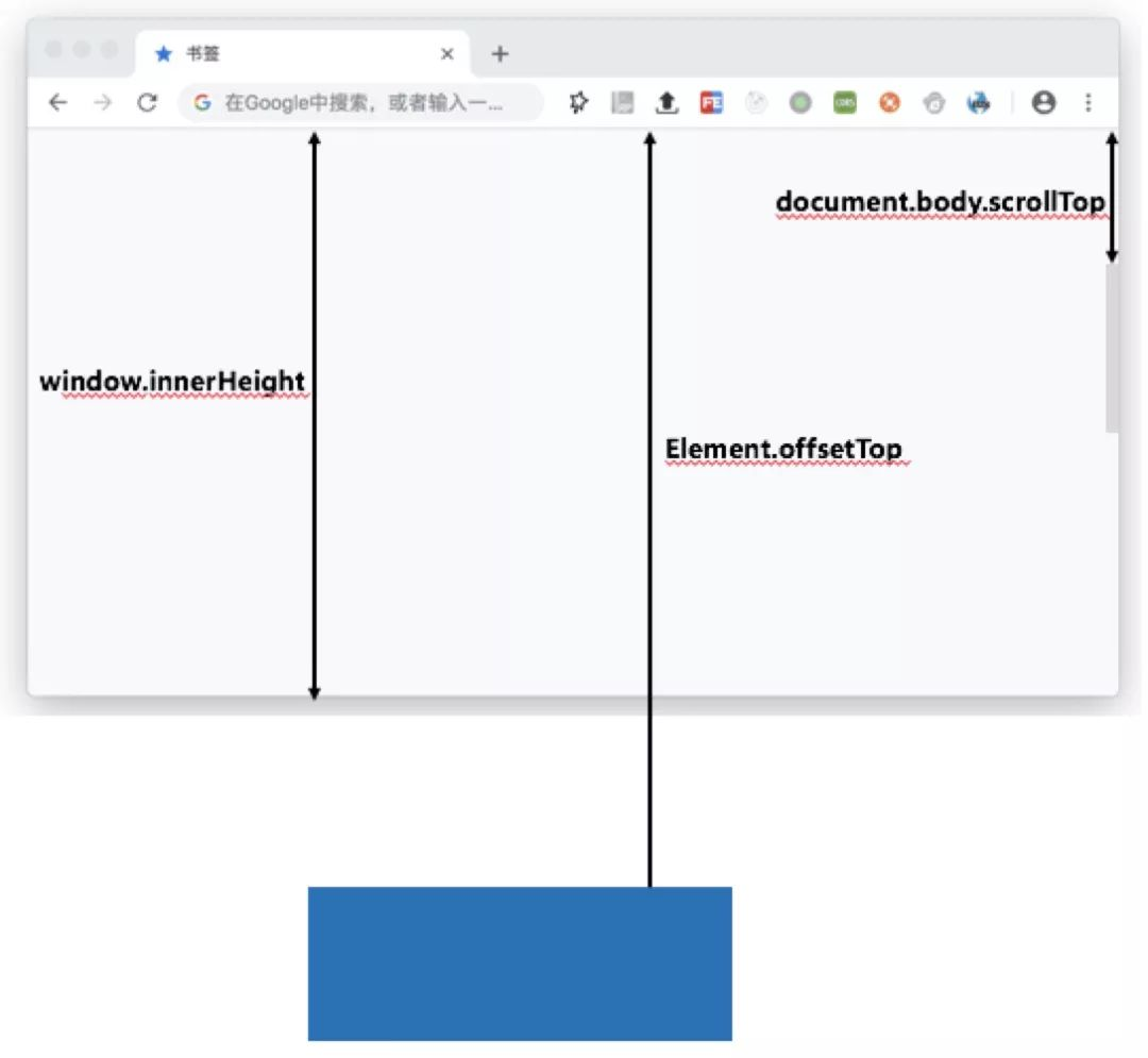 首先我们获取元素 Element.offsetTop ,获取可视区高度 window.innerHeigh 。 随着页面滚动,实时获取滚动条的高度 scrollTop ,如果元素 Element.offsetTop - 滚动条的高度 scrollTop 小于可视区高度 window.innerHeight 的时候,开始加载数据。