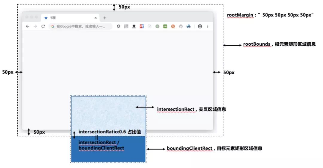 intersectionRect :返回根元素和目标元素的交叉区域的信息。