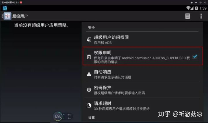 打开安装好的安卓模拟器,并在模拟器中安装微信、RE文件管理器,下载好的RE文件管理器安装包直接拖拽进打开的模拟器窗口就会自动安装,设置模拟器允许应用获取root权限,点击首页右下角设置,找到超级用户选项,点进去即可,这些操作的目的都是为了能让RE文件管理器顺利的获取到ROOT权限步骤如下图所示:
