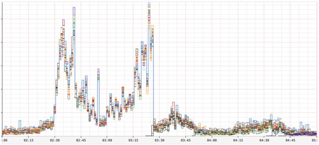 然后凌晨 3:25 之后,自动扩展机制开始启动更多的服务器,每台服务器收到的 RPS 是现有服务器的约两倍,因为它们还没有任何阻塞线程,因此可以成功地处理更多流量。