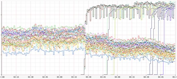 在显示每台服务器 RPS 的下图中,可以看到凌晨 3 点之前,服务器之间的分布很宽。这是由于负载均衡器向阻塞线程数较多的服务器发送的流量较少。