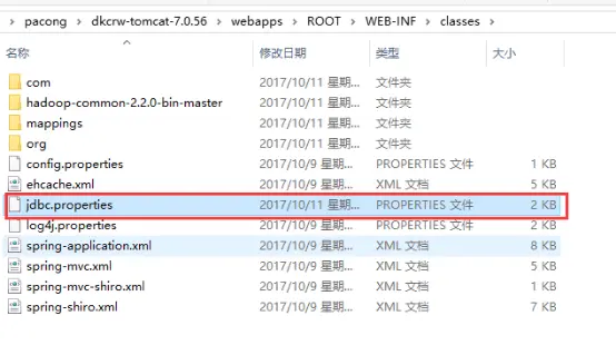3、把已修改的crawler\dkcrw\下的jdbc.properties配置文件替换到\crawler\dkcrw-tomcat-7.0.56\webapps\ROOT\WEB-INF\classes下(这下面有一个没有改好的直接替换)