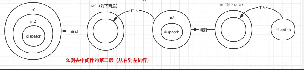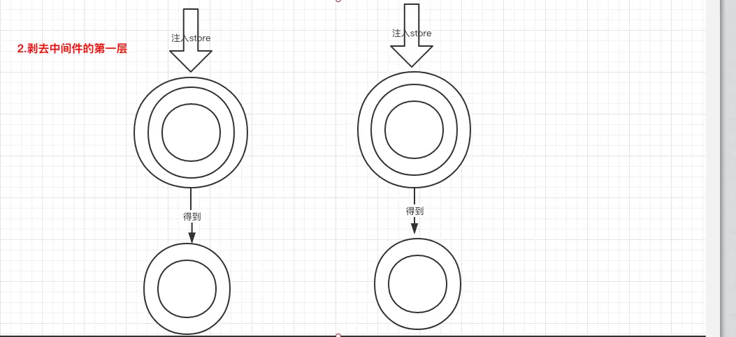 - 调用applyMiddleware方法的时候,redux会把我们的中间件剥去两层外衣。剥开第一层的时候,往里面注入简化版的store实例;剥开第二层的时候,往里面注入上一个中间件(按照注册中间时的顺序来算)的最里层的函数。以此类推,中间件数组最后一个中间件的第二层被剥开的时候,注入的是原生的dispatch方法。