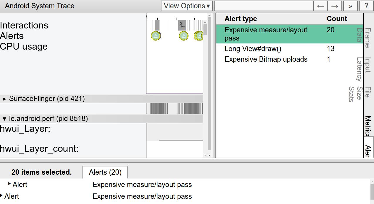 Systrace 会自动突出显示此布局中的(大量)性能问题,并给出修复这些问题的建议。通过点击“Alerts”标签,您会发现,绘制此视图层次结构需要反复执行 80 次的测量和布局阶段,开销极为庞大!触发开销如此庞大的测量和布局阶段当然很不理想,如此庞大的绘制 Activity 会导致用户能够觉察到丢帧的现象。我们可以得出这样的结论:这种嵌套式层次结构和 RelativeLayout(会对其每个子对象重复测量两次)的特性导致性能低下。