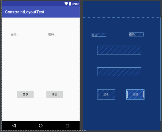 可以看到,我们给登录按钮的右边向Guideline添加约束,登录按钮的下面向底部添加约束,并拖动按钮让它距离底部64dp。然后给注册按钮的左边向Guideline添加约束,注册按钮的下面向登录按钮的下面添加约束。这样就实现了让两个按钮在水平方向上居中显示,在垂直方向上都距离底部64dp的功能了。
