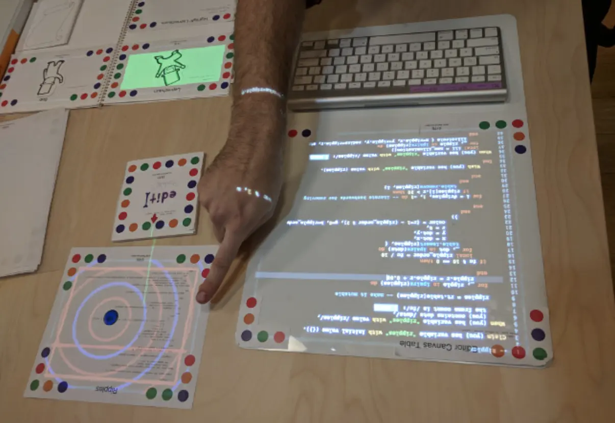 Dynamicland在天花板上使用商业相机和投影仪来跟踪物理对象的位置并投影到它们上面。彩色圆点便是为了更方便机器视觉识别。Dynamicland不是关于投影仪的,而是关于可以在公共环境中编程的物理对象。Dynamicland只是从相机和投影仪开始,但Realtalk与所使用的传感器和执行器无关。Dynamicland正在积极尝试其他计算机参与物理世界的方式,例如通过机器人技术。