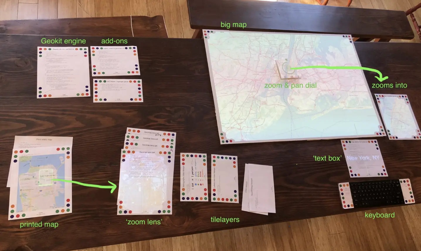 当我在1月份访问Dynamicland时,我正在构建一个类似电子表格的程序,旁边是我的朋友Omar,他正在构建一个基于地图的界面。我们相邻而坐,能够随时了解对方的情况。有时,Omar需要一种方式来输入数字以控制地图缩放。我的电子表格程序有很多数字,以及操纵数字的方法,所以我们将我的一张纸滑过去,它立即就放大了他的地图。Omar更想要基于滑块(slider)的数字输入,在它被构建之后,他将它滑到我的桌子边,我们使用了一个乘法运算符来扩展滑块的范围。它再次生效了。在Dynamicland,您可以“免费”获得可组合性和互操作性。