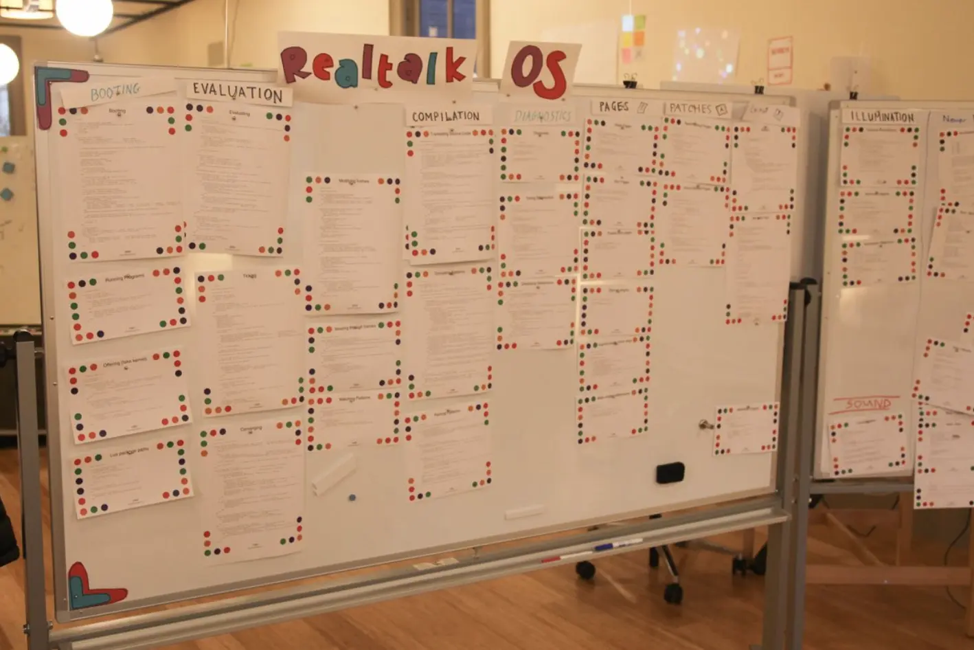 Dynamicland被设计成可理解的,并且可由任何人修改。这个空间几乎有着杰斐逊式的乡土个人主义精神。代码始终以普通格式显示,并在纸页上打印。此外,编写超过11x17尺寸的纸张的代码被认为是“糟糕的风格”。整个系统Realtalk OS仅有数千行代码,代码张贴在背靠背的两个白板上。