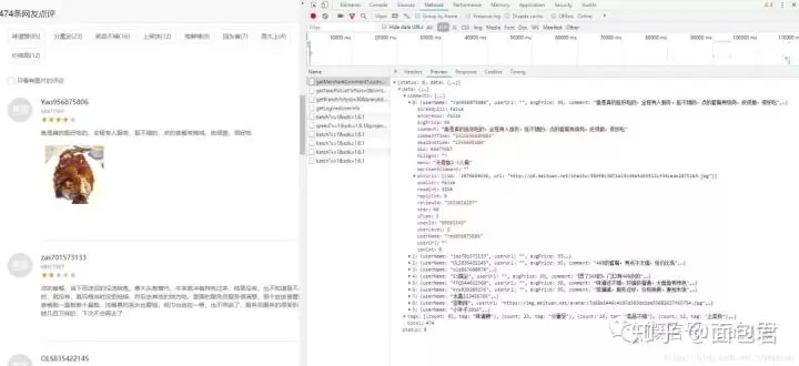 #店铺详细页的评论信息,和前面店铺的id获取一样,也是XHR异步加载得来的(知道数据来源就很简单了,就只是解析json字符串而已)