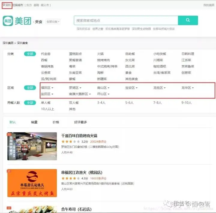 我爬取的区域是深圳市,因此以深圳的美食为例,分析其网页架构: