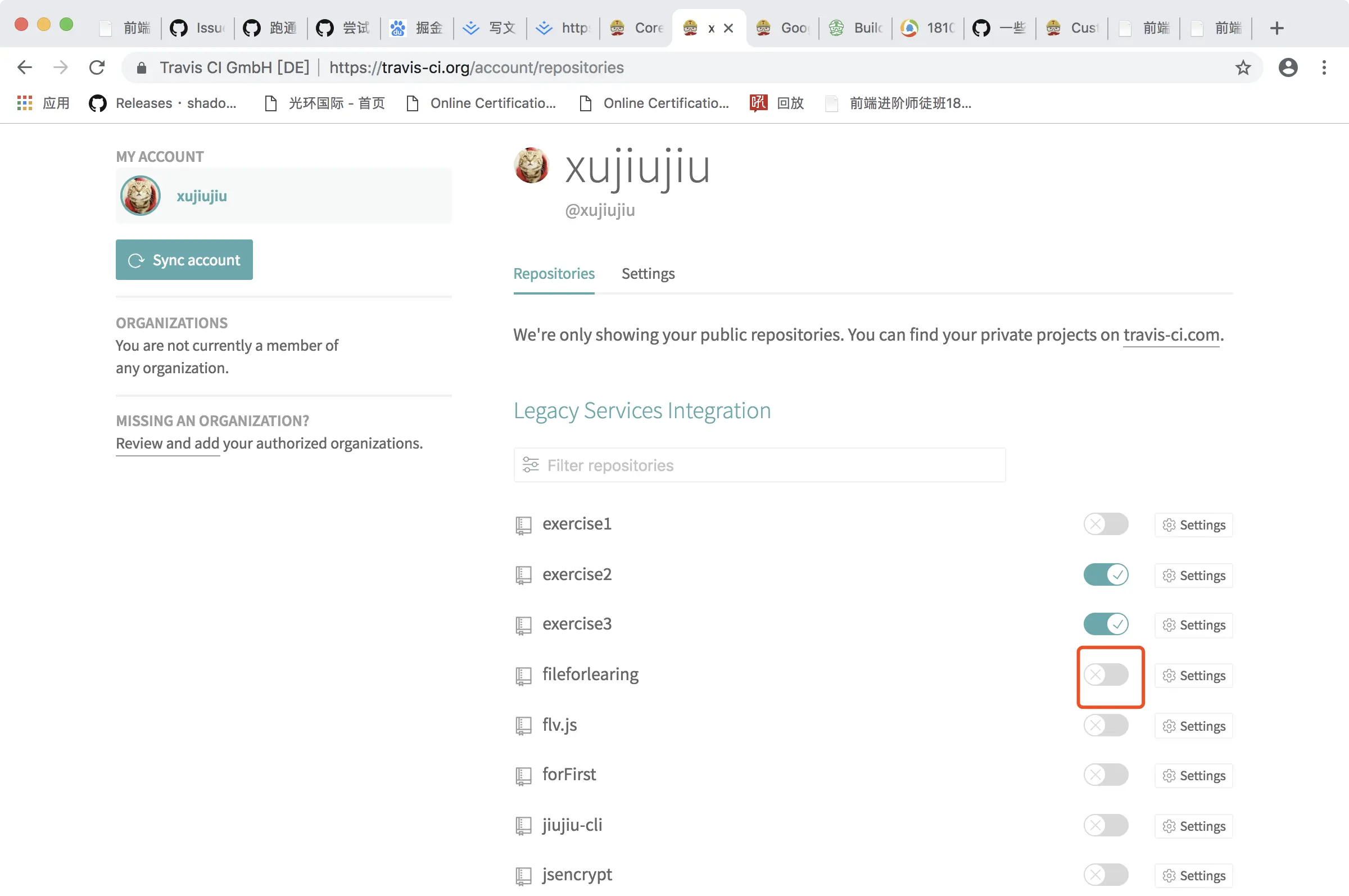 这上面绿色的那两行就是已绑定的git仓库,并且有配置travis的,若需要增加,可点击绿色行,进入下面的页面