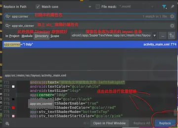 如果开发者使用的是 AndroidStudio,从 Edit > Find > Replace 打开批量替换对话框,然后按照下图操作即可。