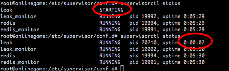redirect_stderr=false这里memmon事件监听器监听的是TICK_60事件,也就是每60秒间隔触发一次的事件,这使得memmon会每60秒检测一次对应的监控项的占用内存情况,这里设置的是监控leak监控项,如果其内存占用超过1MB,则会重启进程,并发送邮件进行告警。 起到该进程后,查看状态