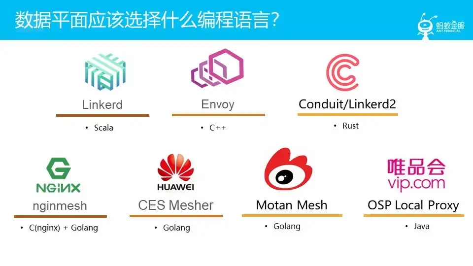 图中列出了目前市场上主要的几个 Service Mesh 类产品在数据平面上的编程语言选择。