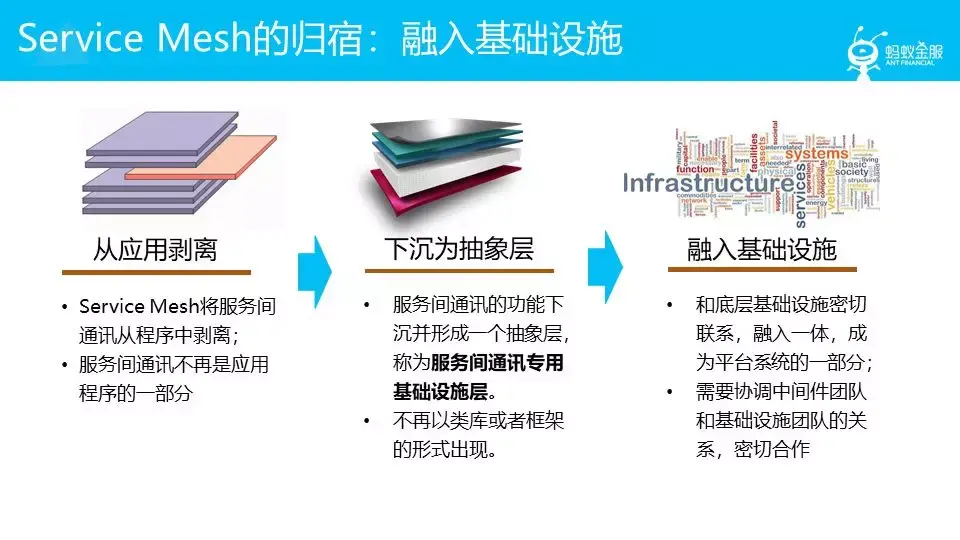 对于 Service Mesh,我们有一个重要判断,这也是今天最想和大家分享的一点:Service Mesh 的归宿,或者说最终的形态,是下沉到基础设施!
