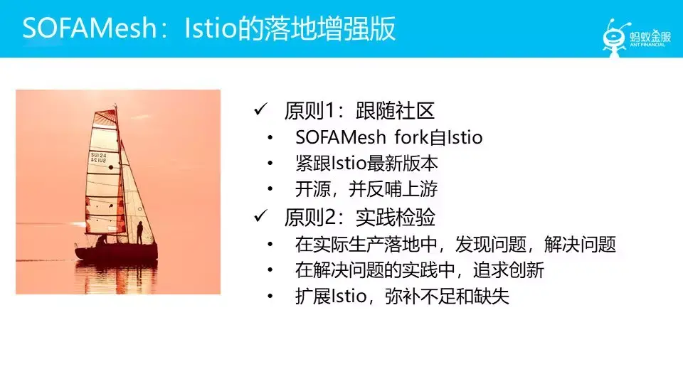 SOFAMesh 是蚂蚁金服推出的 Service Mesh 开源产品,大家可以简单的理解为是 Istio 的落地增强版本。我们有两个原则: