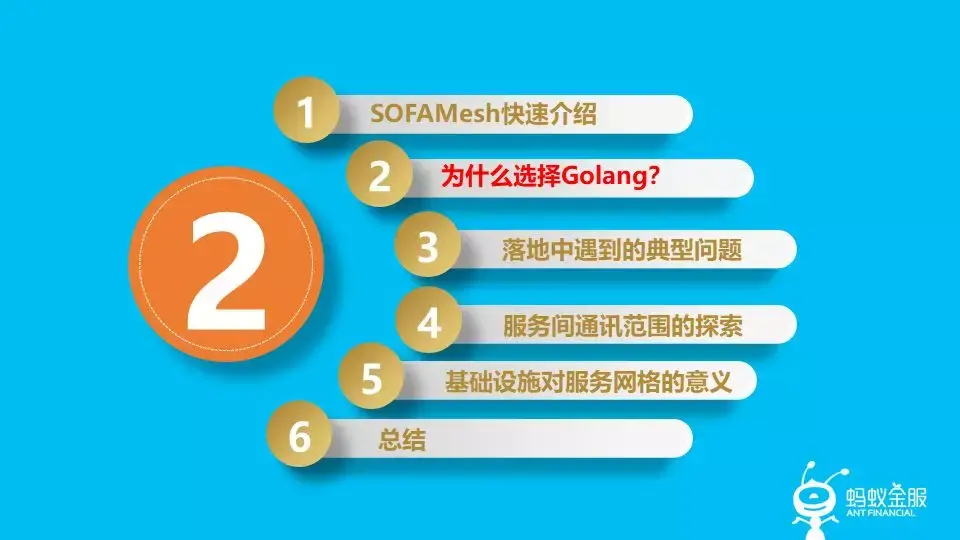 其次给大家介绍了选择 Golang 的原因,主要是因为语言栈的长期选择。如果有正在进行 Service Mesh 技术选择的同学,可以作为参考。如果和我们一样,更愿意在未来保持 Golang 和 Java 为主要语言栈,则可以参考我们的方案,当然我们更希望你们可以和我们一起来共建 SOFAMesh 这个开源项目;