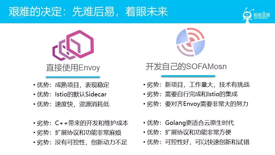 开发自己的 Golang 版本的 Sidecar,全是劣势:这是一个全新项目,工作量非常大,而且技术上很有挑战,还有需要自行完成和 Istio 集成的额外工作量以及维护成本,最大的挑战还在于 Envoy 丰富甚至繁多的功能,要向 Envoy 对齐需要非常大的努力。