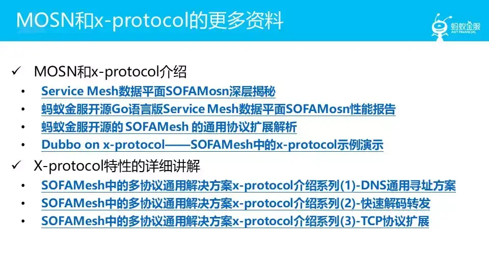 然后给大家分享了我们遇到的几个典型问题,如何快速的支持更多通讯协议,如何让传统的 SOA 架构的应用程序在不进行代码修改的情况下也能从 Service Mesh 中受益,实现系统的平滑迁移。对于准备实际落地的同学会有帮助,由于时间所限未能将细节展开,大家可以会后查看资料或者直接找我们交流;