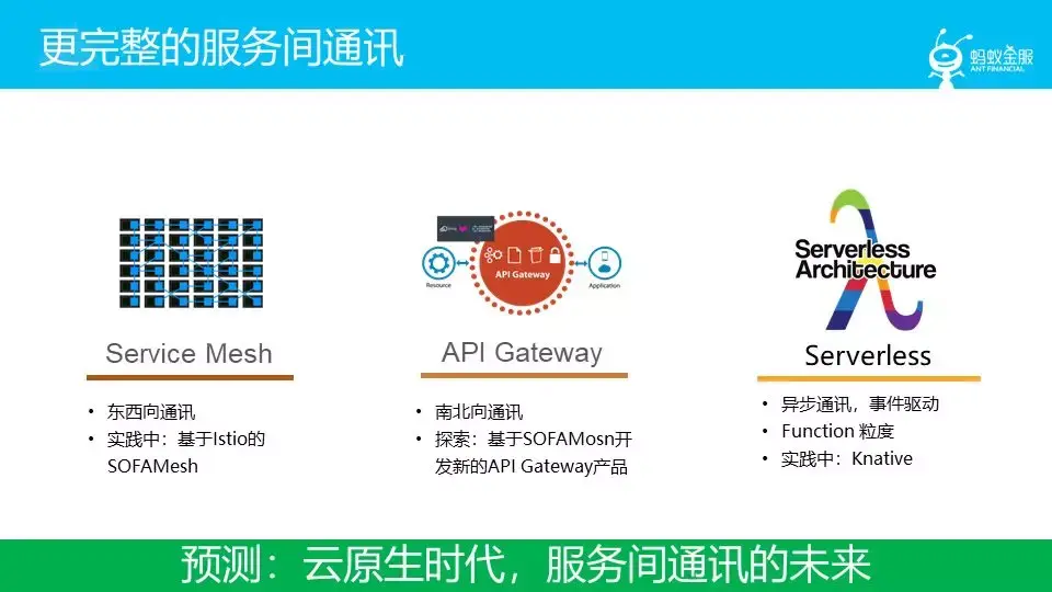 负责异步通讯,事件驱动模型,粒度也从服务级别细化到 Function 级别,目前在积极探索和实践 knative。