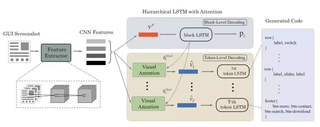 卷积神经网络在图像处理上无与伦比,它可以从图像抽取到非常精炼的高级语义特征,这些信息不论是做分类还是做定位都没问题。但如果我们利用这些特征生成用户界面代码呢?那么就需要同样强大的模型将这些高级特征解码为一条条代码。最近西安交通大学提出一种用户界面转代码的新算法,该算法根据代码的层级特性构建了一种基于注意力的强大解码器。