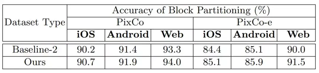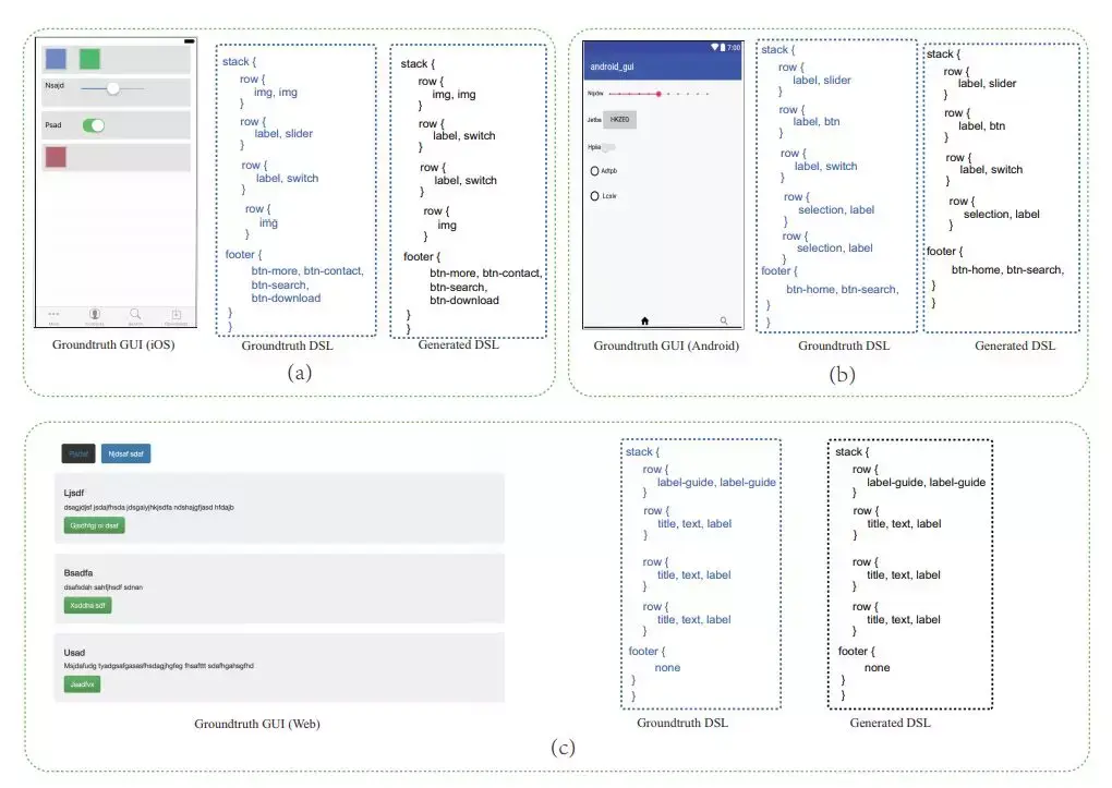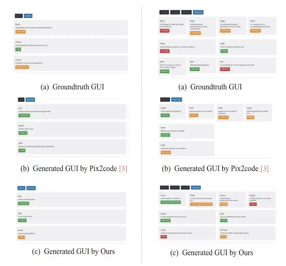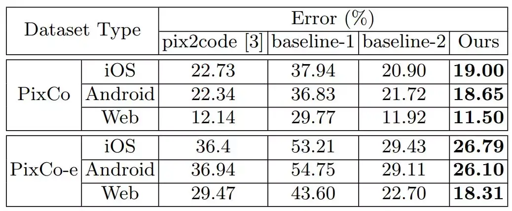 研究者在 pix2code 所提供的基准数据集进行了测试,且实验结果表明他们的方法是非常高效的:他们的模型在所有三种子数据集(IOS、安卓和网页端)都比目前最优的方法要好。此外为了进一步说明他们提出的模型在处理复杂的 GUI 时有更强的优势,他们构建了一个新数据集,该数据集包含具有更多图形元素的 GUI 截图,且图形元素的样式和空间布局更加多样化。研究者表示在新的复杂数据集上,他们的方法会以更大的优势好于其它对比的方法。