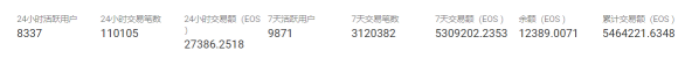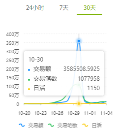 查看了一下近期的交易数据,30天的最高交易额为 3585508.5925,交易笔数1077958,日活1150;二十四小时的交易额为 119898.3676。