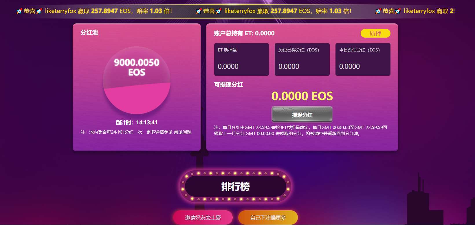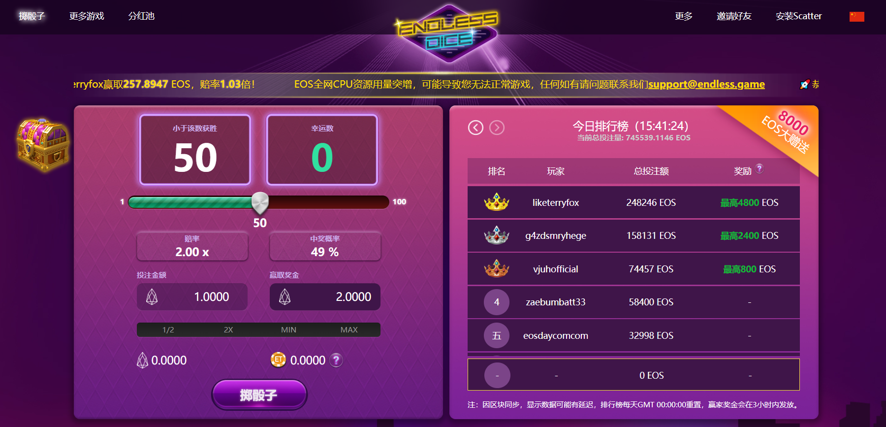 这个游戏的大部分机制和 BetDice Dapp 差不多,需要玩家安装 Scatter 钱包用 EOS 进行交易(尽量保证有0.5 EOS)。作为主界面的掷骰子,和 BetDice Dapp 一样通过压数值比大小获得不同倍率的奖金。不同点是投注EOS 可以得ET ,而这些获得的 ET 可以在分红池进行质押。