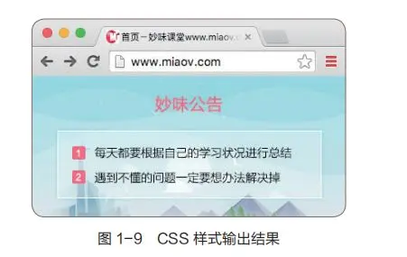 从图 1-9 中可以看到,使用 CSS 样式可以修改页面内容的对齐方式、颜色以及背景颜色等样式。两图相比较,图 1-9 更加丰富多彩,更能突出重点,也更吸引人。