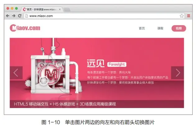 一种脚本式语言,它可以让网页响应某些“行为”。例如用户在网页中用鼠标单击某个按钮以后,如果他希望浏览器能够切换下一张图片,这样的想法就可以通过 JS 来实现。在图 1-10 中, 用户可以通过单击图片左、右两边的 < 和 > 箭头来实现图片的切换。