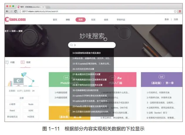 又或者我们希望在搜索框中输入部分内容时能在弹出的下拉框中显示出所有相关的数据供用户选择,如 图 1-11 所示。这种根据部分内容弹出下拉框并显示出所有相关数据的效果使用 JS 将很容易实现。