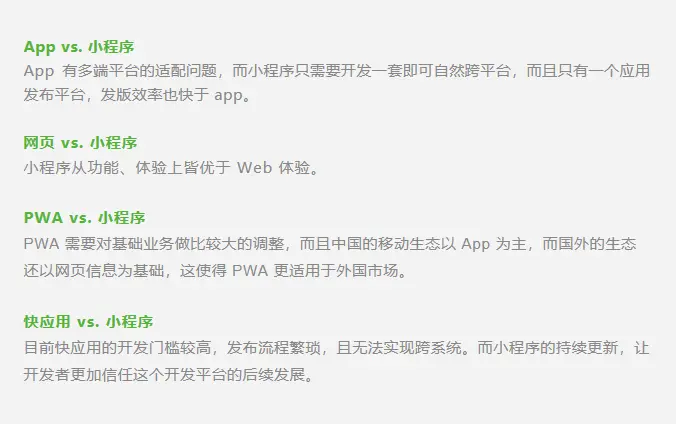 我们团队还在不同层面上比较了小程序和快应用、app、网页、PWA 的优劣性。