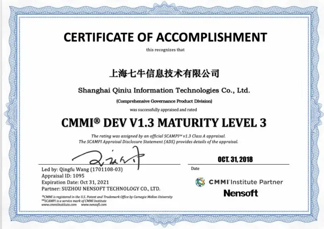 10 月 31 日,在上海七牛信息技术有限公司青岛会议室举行的 CMMI3 级认证结果发布会上,主任评估师王庆付老师和评估组向公司高层及参与评审的 EPG 成员及项目组成员郑重宣布:经过严格的现场审核和评估,上海七牛信息技术有限公司已经达成了 CMMI3 级目标,成功通过 CMMI3 级认证。