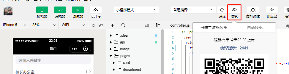 首先要预览,开发者(商家)开发完一小程序后,都需要在手机上先预览一下再发布,因为由于各种原因会导致错误,我们为了查看有没有问题,或想看看真实的体验怎么样。这一步必不可少!如下图所示,击“预览”。