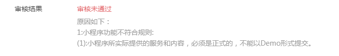 原因如下: 1:小程序功能不符合规则: (1):小程序所实际提供的服务和内容,必须是正式的,不能以Demo形式提交。