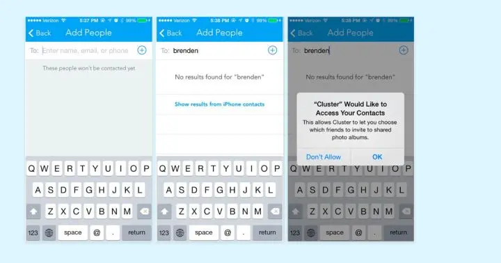 相对于前面的几种做法它所出现的时间节点会更好。当用户输入一位联系人的信息时发现并没有结果,这个时候再来请求用户提供通讯录的授权,用户的意愿度也将远高于刚进入应用的时候。