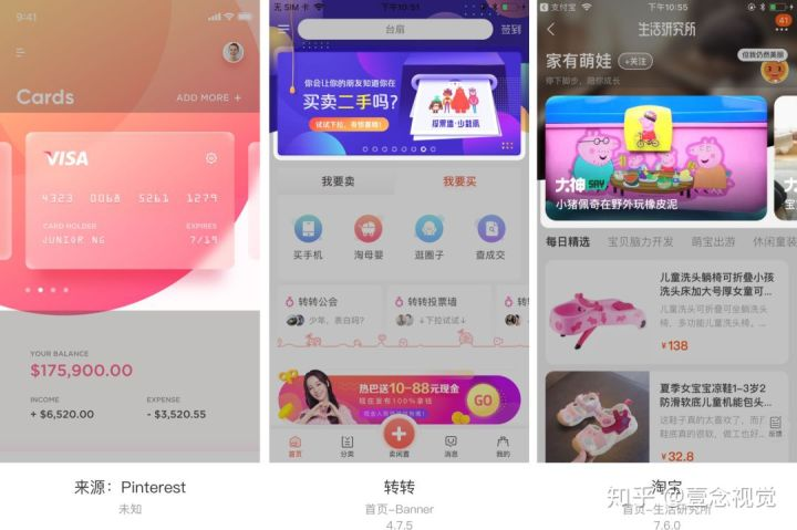 当然这里以熊猫金库举例是因为它并没有采用相同颜色切换,而是都采用了左侧文字,右侧吉祥物的设计,而且采用的不同颜色饱和度明度也趋向一致,所以这样对APP的视觉呈现效果并没有起到反效果,反而有加分。
