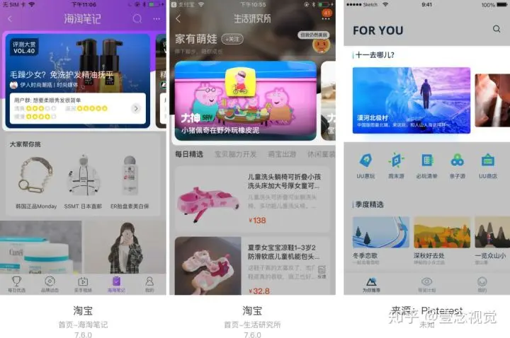 信息展示类侧滑分为常规图文类、图片嵌套卡片式信息的形式和视频展示类。例如:淘宝的海淘笔记页面为图片嵌套卡片式信息的形式,淘宝的生活研究所为视频展示类侧滑,也就是滑动到哪个哪个Banner可以自动播放视频。一般信息展示类侧滑多用于产品的二级页面。