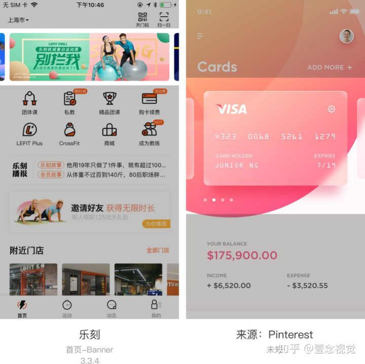 上图的乐刻App首页采用的为大小一致平行轮播、第二个为景深类轮播、第三个为景深类异形轮播、最后一个为一致类弧形轮播。一般拓展应用的话会采用文字等特殊排版来进行一致性统一。