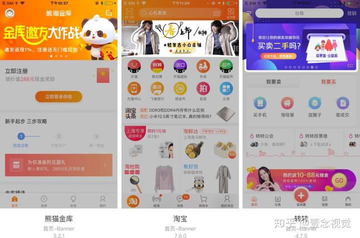不难发现熊猫金库在这里就采用的是全部撑满的样式,而我们的淘宝采用的却是屏宽撑满的弧形样式,转转则采用的是未撑满的样式。总的来说,单张切换样式主要用于首页Banner的展示。