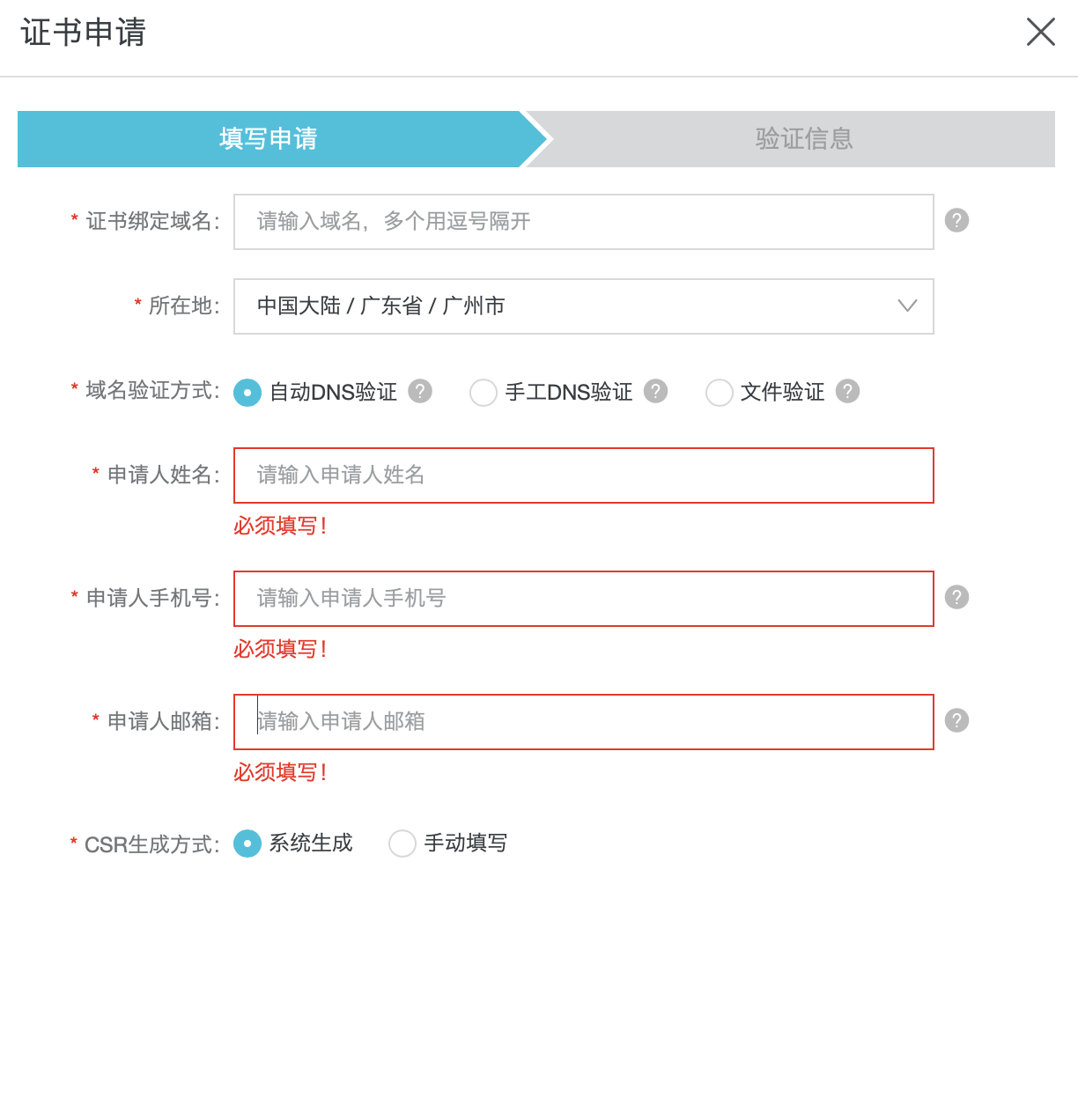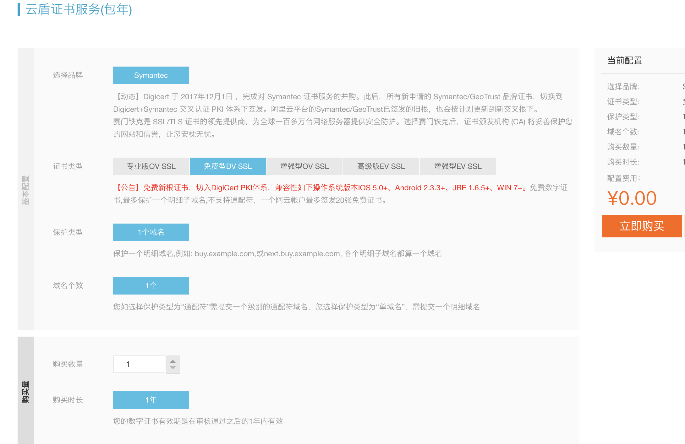 2.申请ssl证书,因为我的域名是阿里申请的,阿里有提供免费的证书,所以我就到对应的域名平台下生成证书就可以了