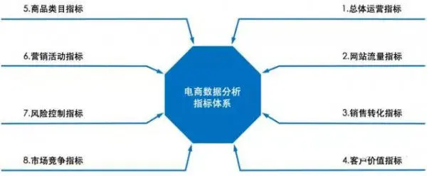 电商数据分析的指标体系分为八大类指标,包括总体运营指标、网站流量累指标、销售转化指标、客户价值指标、商品及供应链指标、营销活动指标、风险控制指标和市场竞争指标。不同类别指标对应电商运营的不同环节,如网站流量指标对应的是网站运营环节,销售转化、客户价值和营销活动指标对应的是电商销售环节。完整的指标体系有助于各部门对其业务开展情况进行合理评估及规划。