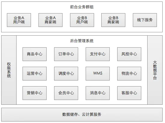 电商后台由一系列业务模块组成,支撑着公司各项业务的进行和发展,为前端展示、业务处理、库存变动以及后台各模块间互相调用接口等提供数据支持和相关服务。很多公司将其拆分为多个子系统,类似阿里这样的超大型电商更将其发展成了中台事业群(包括搜索、数据和业务平台)并启动了“小前台、大中台”的业务战略,可见电商后台的重要性正在被不断凸显。